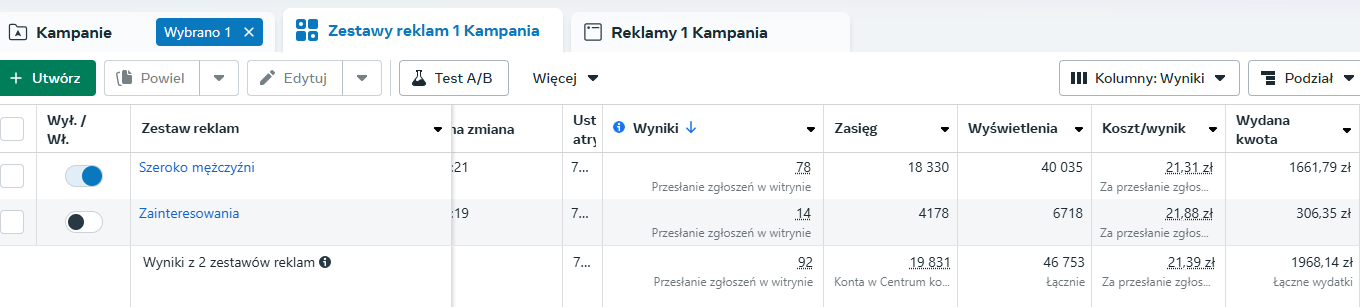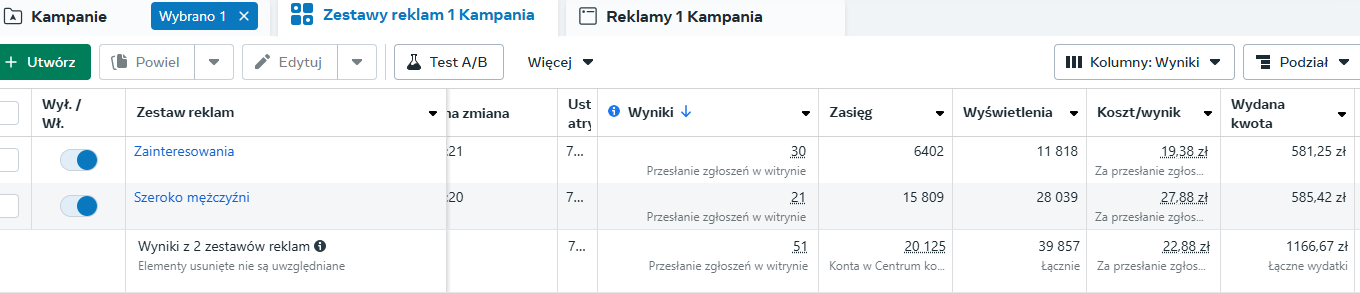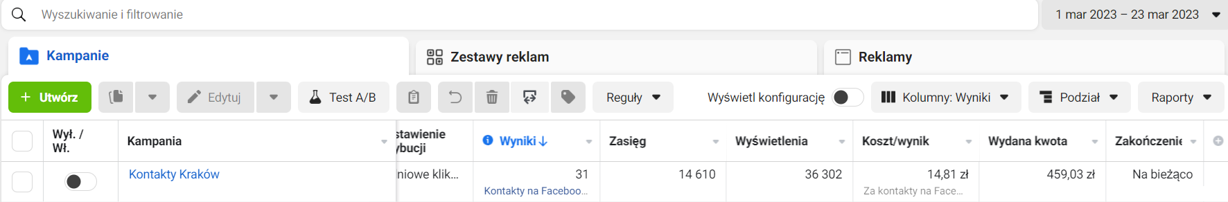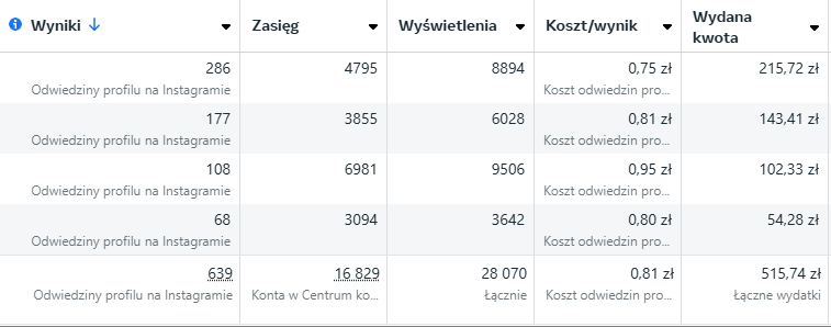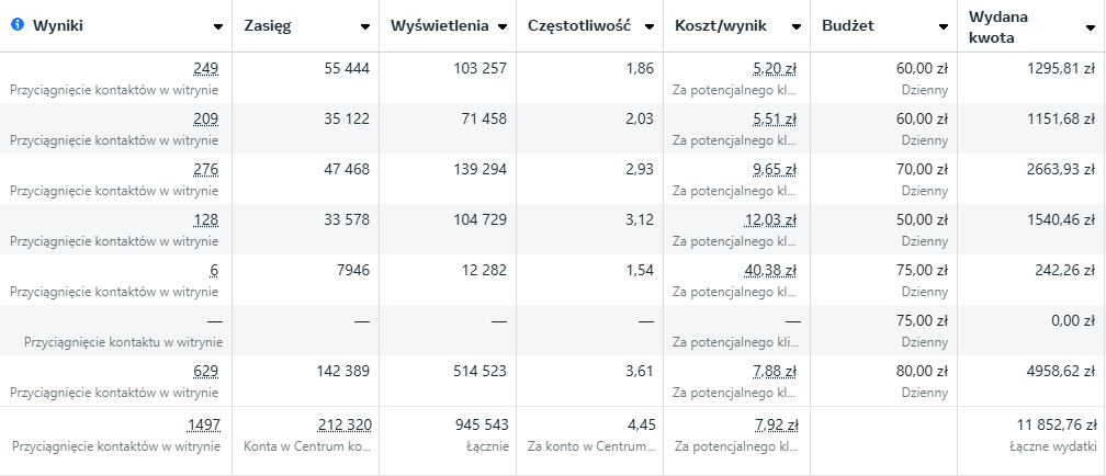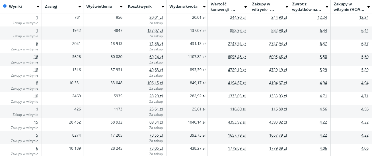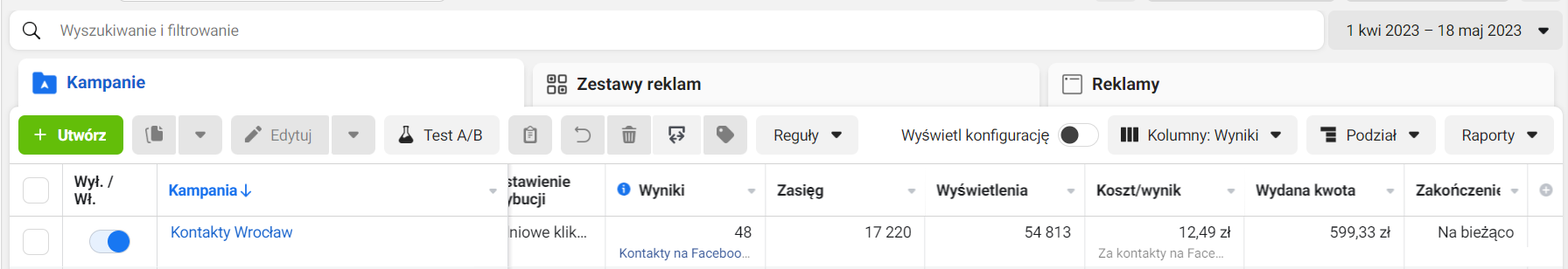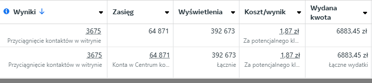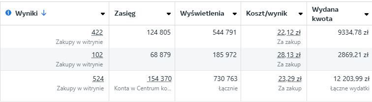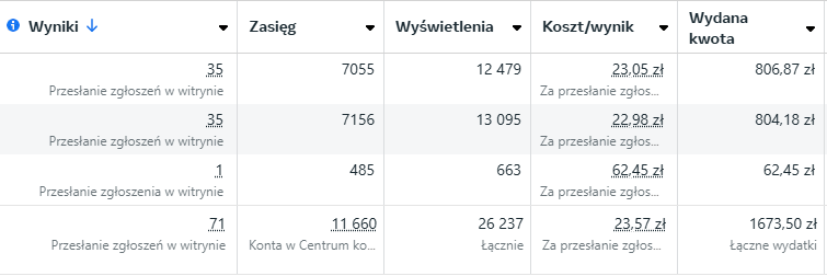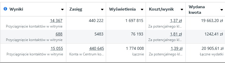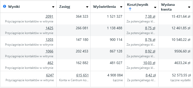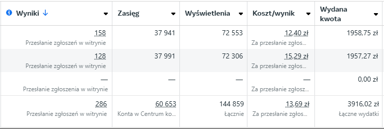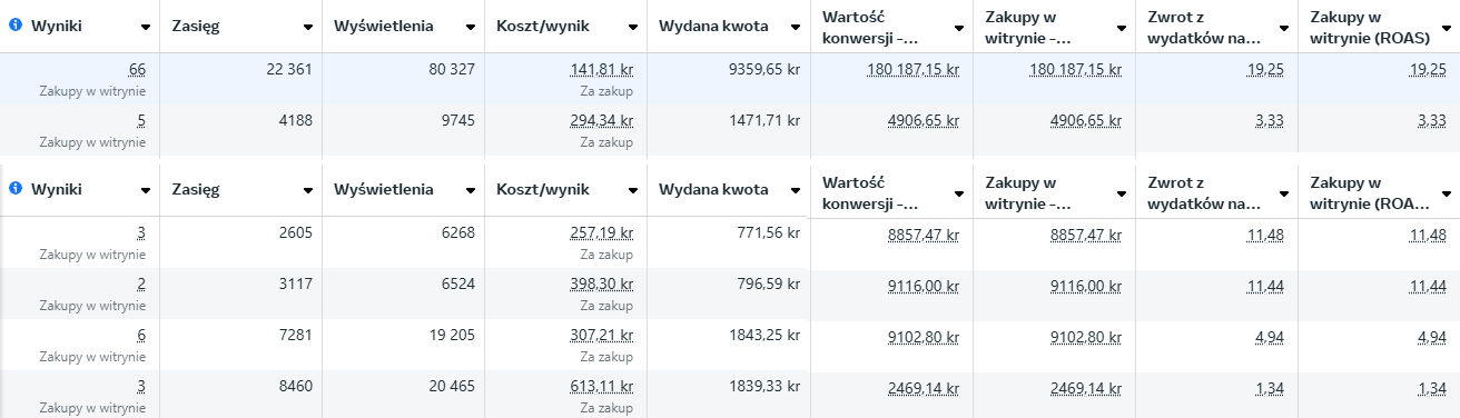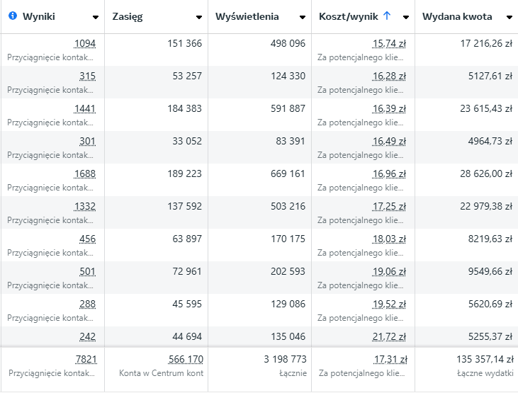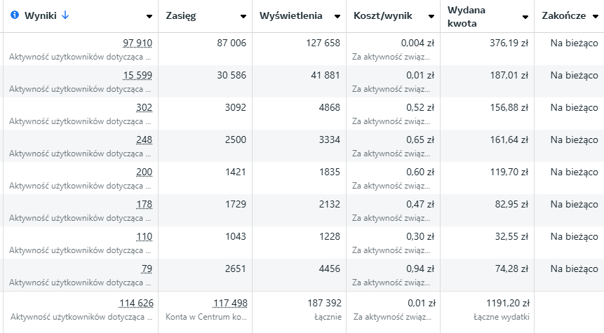 Poniżej jeszcze kilka wyników z kampanii reklamowych META: